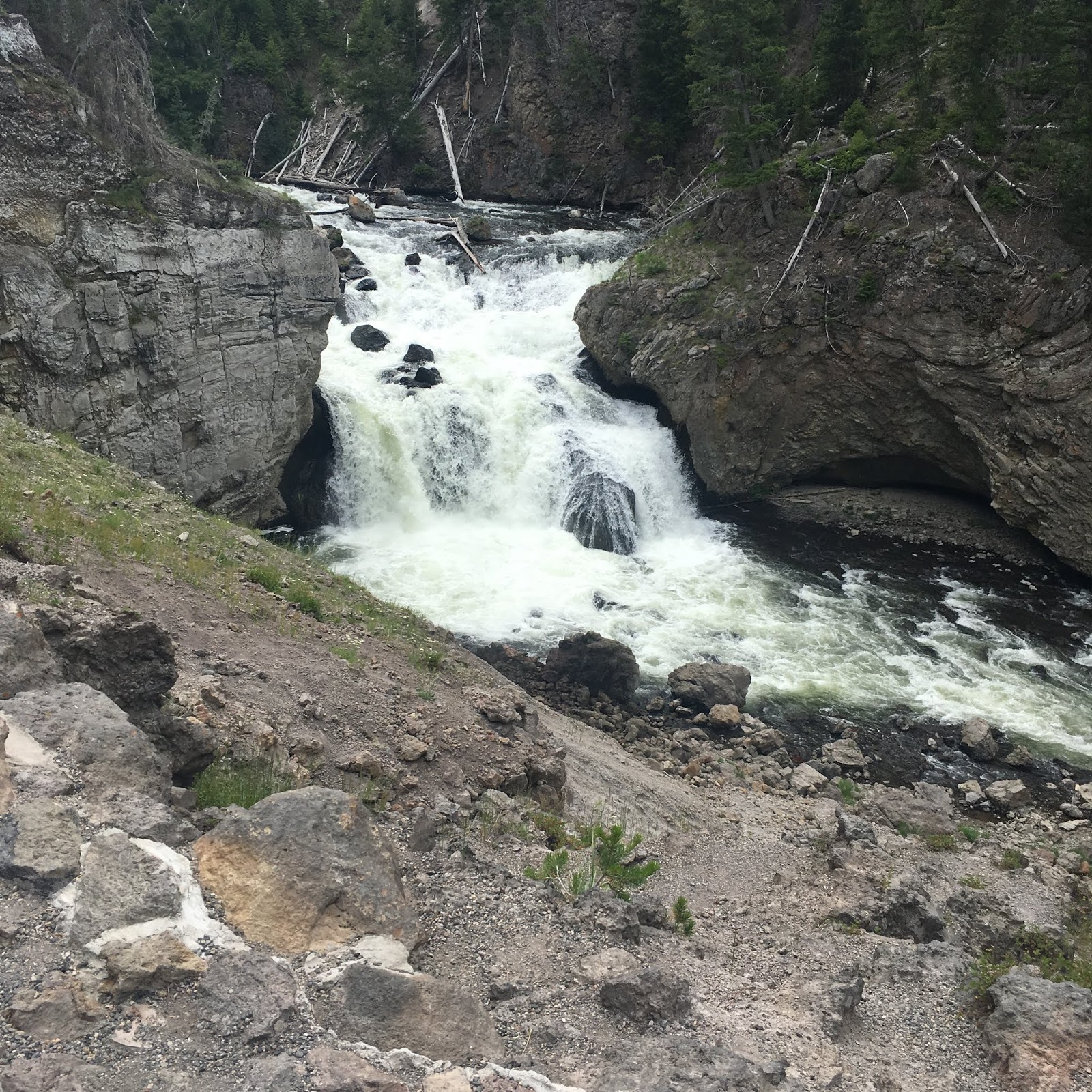 I followed the Firehole River, stopping at Kepler Cascades and a gorgeous deep canyon. I stopped at Midway geyser basin and saw numerous beautiful tourquois hot pools surrounded by copper colored rocks. These hot springs are the source of the Firehole River, the name of which now makes sense to me.